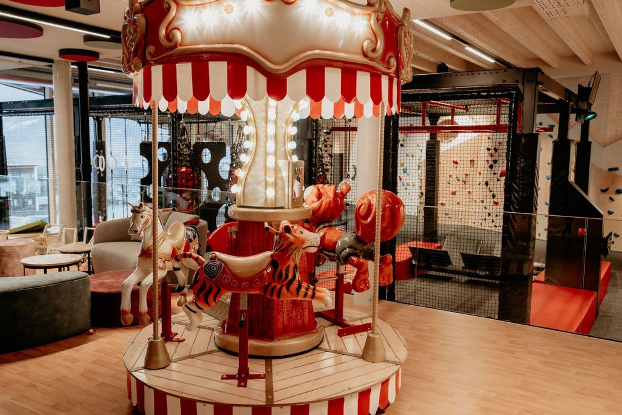 Indoor Spiel- und Betreuungsbereich. Turnsaal, Softplay Anlage, Teenielounge etc.