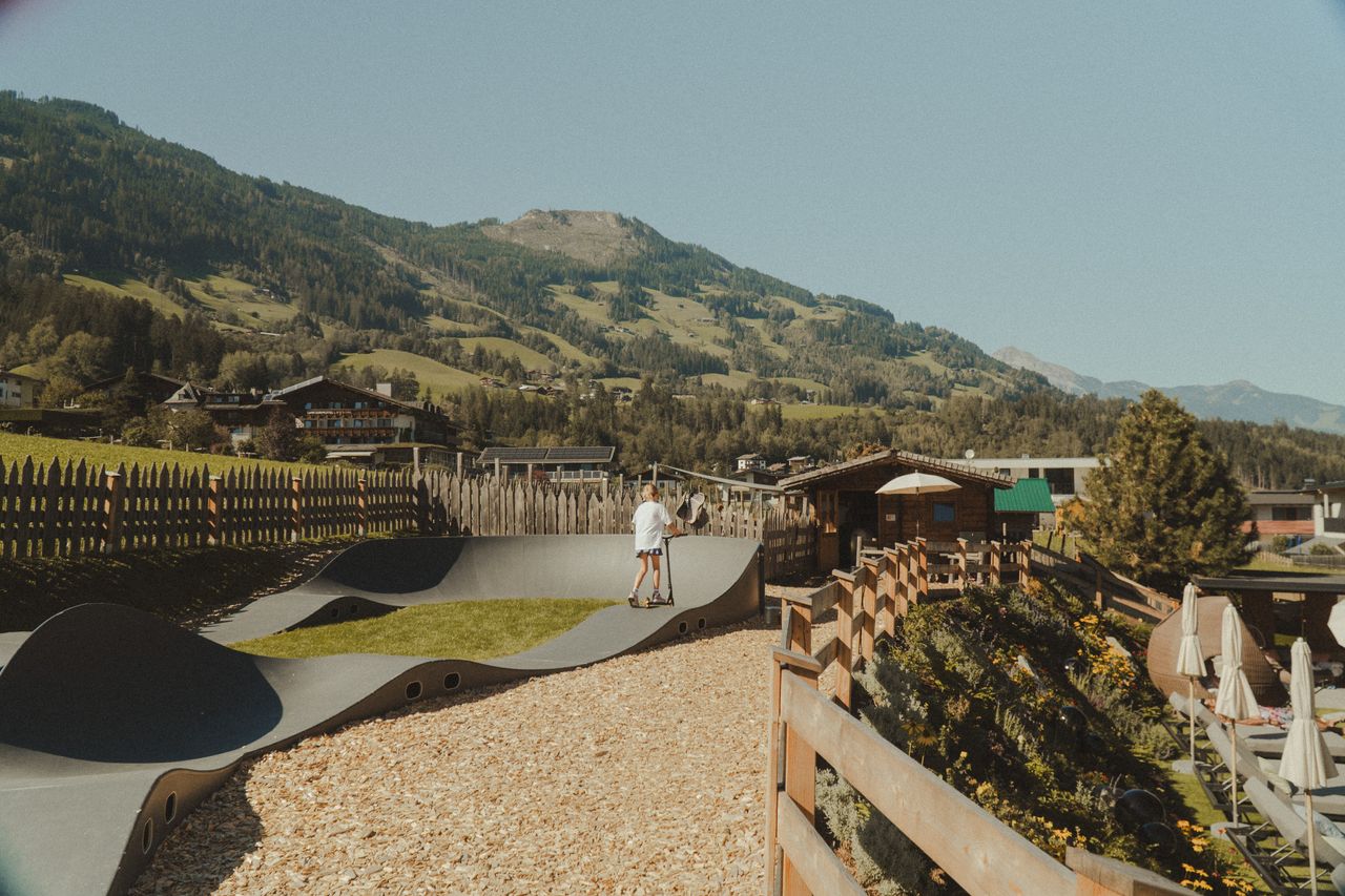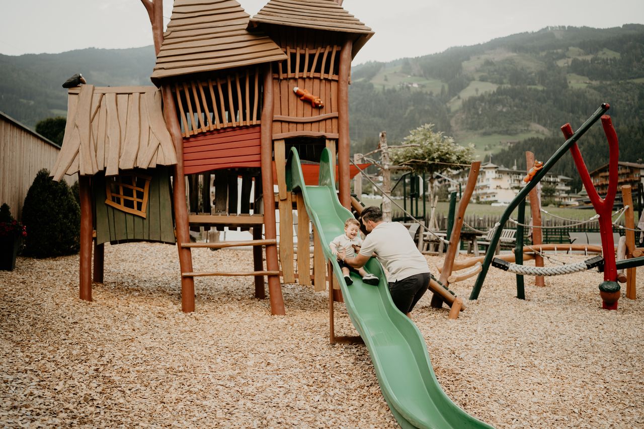 Super Außenspielbereich „mehr als 1500 m²“ direkt am Hotel mit Trampolin, Hüpfburg, Kletterturm, Spielturm, Schaukel Sandkasten, etc... ab 4 Nächten 3 Tage Zillertal Activcard inklusive: