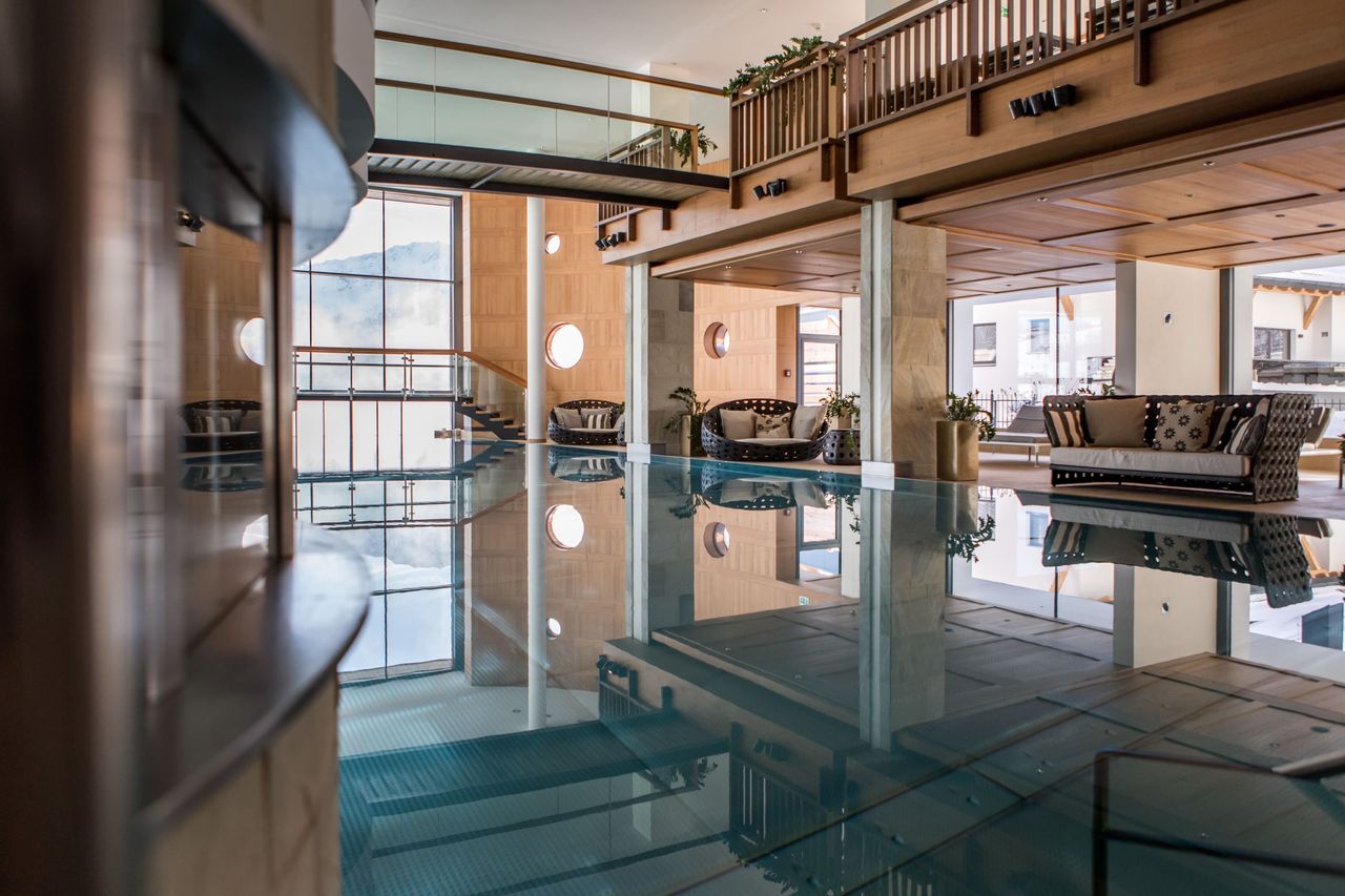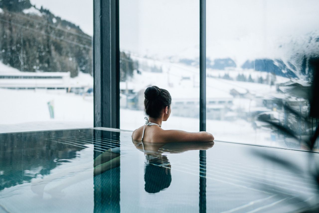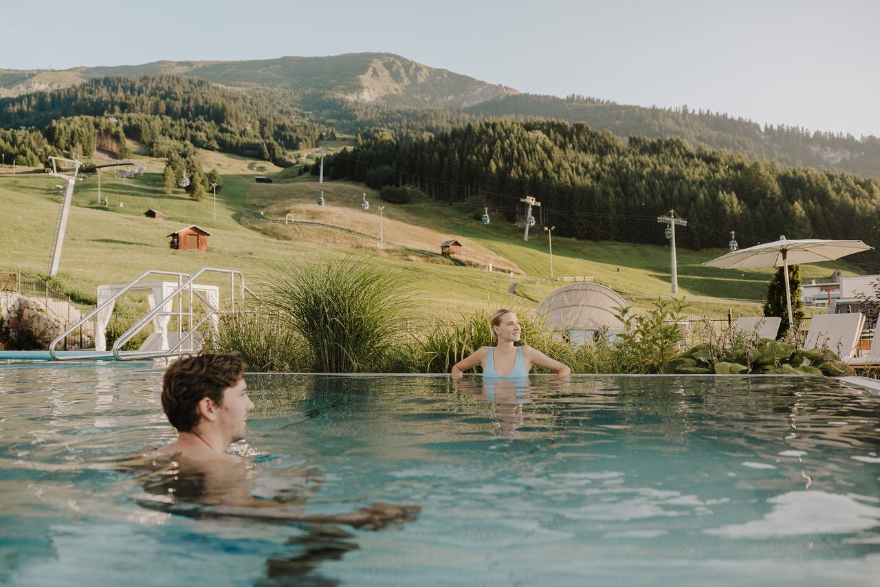 Wasserwelt AquaMonte mit 250 m² großen Panoramapool und Blick auf die Berge