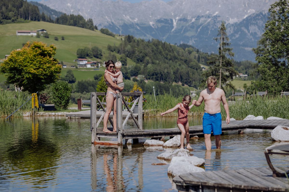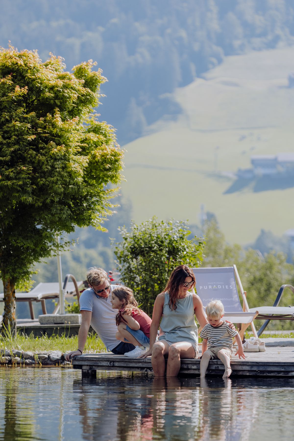 Das Naturresort Puradies Leogang ist ein Traum für Kinder, und für Eltern! Eltern schätzen die Alleinlage ohne Straßen, ohne Autos, mit viel Sicherheit für die Kinder und 300.000 Quadratmetern Wiesen und Wäldern für Naturabenteuer. Kinder lieben es, Bauer Wasti bei den Hasen, Ziegen und Schafen im Bauernhof zu helfen, die Eier fürs Frühstück zu stibitzen, im Naturbadeteich zu tauchen oder im neuen Kinderpool zu spielen. Und dann ist auch noch alles so wunderherrlich entspannt und kinderfreundlich.Liebevolle und naturnahe Kinderbetreuung mit abwechslungsreichem Programm, ein Abenteuerspielplatz der sich gleich neben dem Ziegengehege befindet. Und ganz neu haben wir einen Familien-Schwimmbereich, separat vom ruhigen Adults Only Wellnessbereich. Familienurlaub im Puradies: Wo nichts zu wenig, nichts zu viel, einfach alles genau richtig ist.