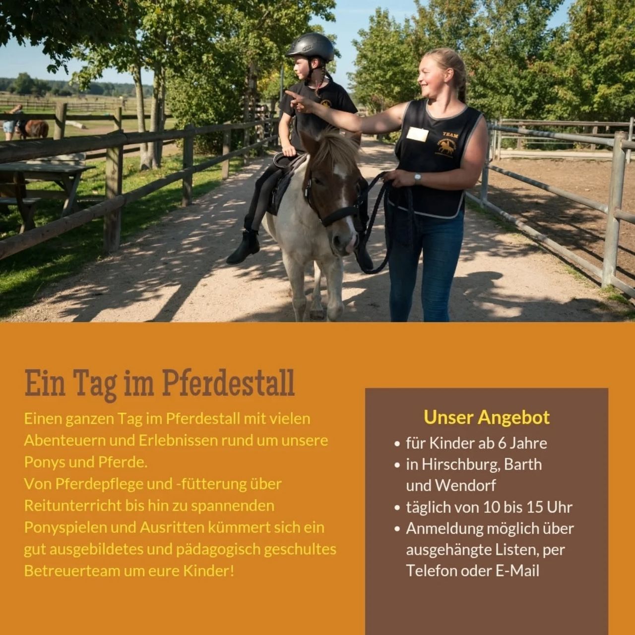 Ob ihr oder euer Kind Reiten lernen wollt, ihr Entspannung sucht oder ihr einfach euren Kindheitstraum wahr werden lassen möchtet - bei uns seid ihr genau richtig. Von Reitstunden auf unseren gut ausgebildeten Schulpferden und Ponys über Kutschfahrt oder einem erlebnisreichen Tag im Pferdestall bis hin zu einem entspannten Urlaub im Seenland oder an der Ostseeurlaub mit Strandritt, Kinderbetreuung und vielem mehr - verbringt eine unvergessliche Zeit auf unseren modernen und großzügigen Reitanlagen.