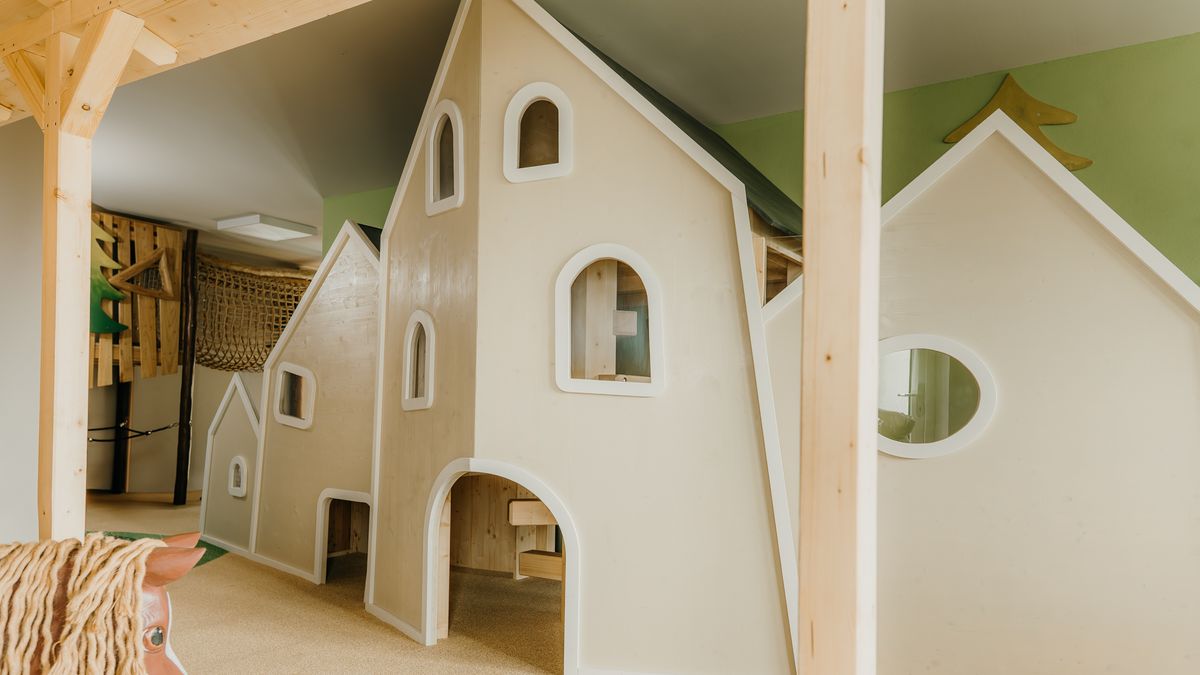 Unser Spielzimmer ist 45 Quadratmeter groß und mit Bereichen zum Malen, Bauen, Basteln und Kochen, einem Spielhaus sowie Büchern und hochwertigen Utensilien für kreative Rollenspiele ausgestattet. Alles geplant und umgesetzt mit dem jahrelangen Know-how der Kinderhotels-Gruppe.