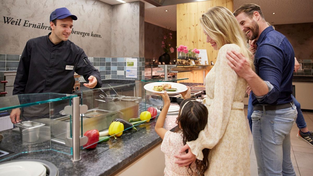 Für die Eltern umfasst die "Halbpension" die Teilnahme am Frühstücksbuffet sowie am Abendbuffet. Zum Abendessen sind im Zeitraum von 18 - 20.30 Uhr ausgewählte Softgetränke, Biere und Weine inklusive. Für Kinder bis 15 Jahre sind im Rahmen von "Kids-All-In" zusätzlich ein Mittagessen (12 - 13 Uhr) sowie ganztags Wasser und Apfelsaft inklusive. Babynahrung wird nicht angeboten. Im Rahmen des Verpflegungsangebotes ist eine vegetarische Ernährung jederzeit möglich. Vegane Speisen bietet das Hotel nicht an. Bitte bringen Sie bei Unverträglichkeiten (z.B. Gluten oder Laktose) Ihre eigenen Ersatzprodukte mit und ergänzen Sie damit das Buffetangebot. Eine separate Zubereitung von Speisen, die Unverträglichkeiten oder Allergien berücksichtigt, ist dem Hotel nicht möglich.